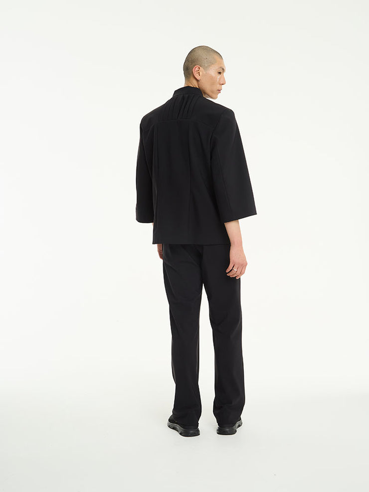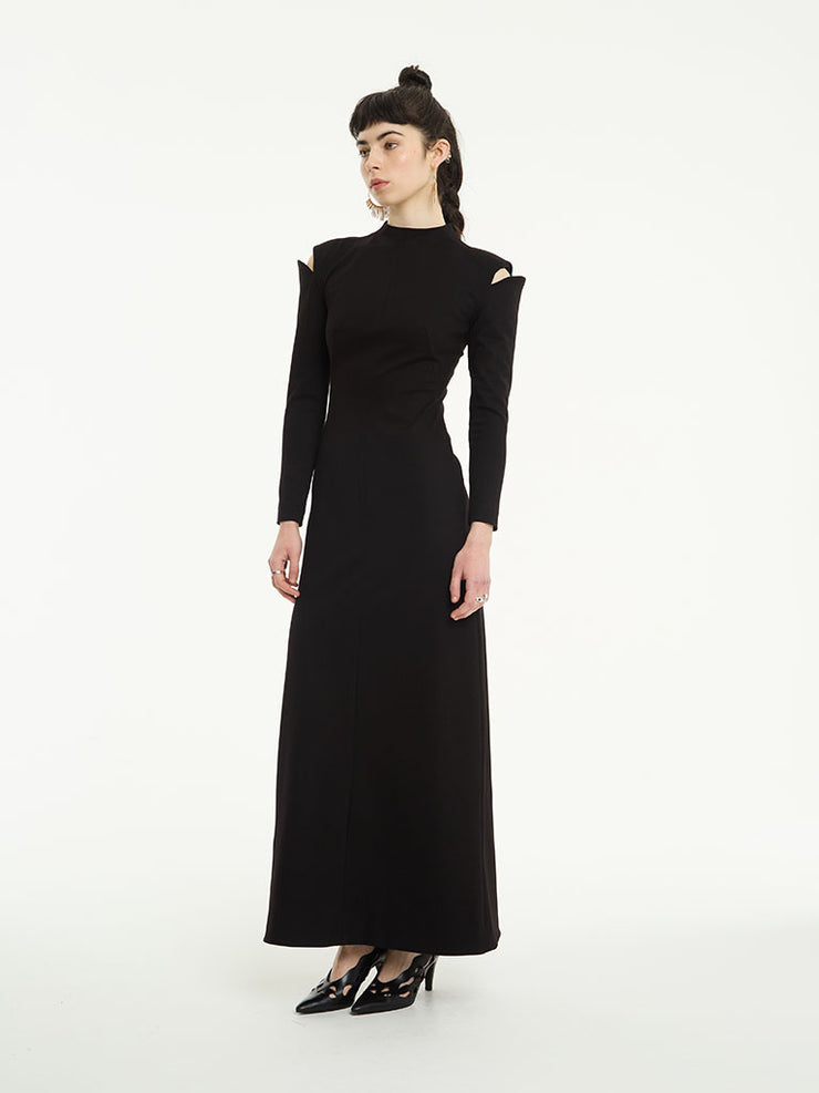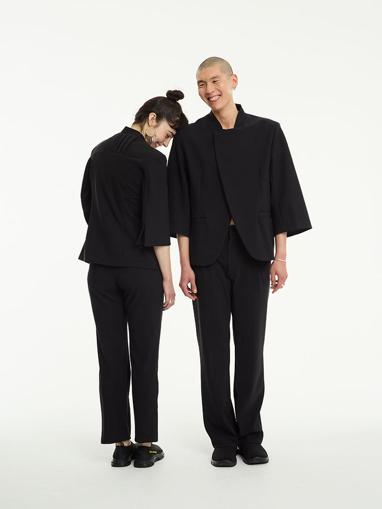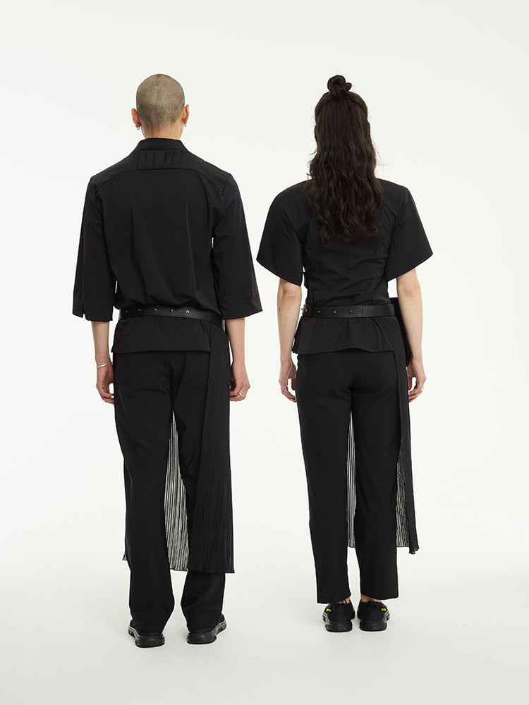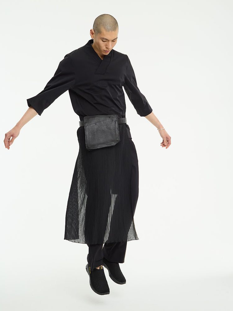 For this we wanted to play on the meaning of the name Komorebi (Dappled light) so included cut-outs, pleating and texture to provide the feeling of light coming through and shadows from depth. Using breathable technical fabrics lent itself to a modern and clean finish alongside leather pouches + pleated skirt panels for the prefect textural contrast.